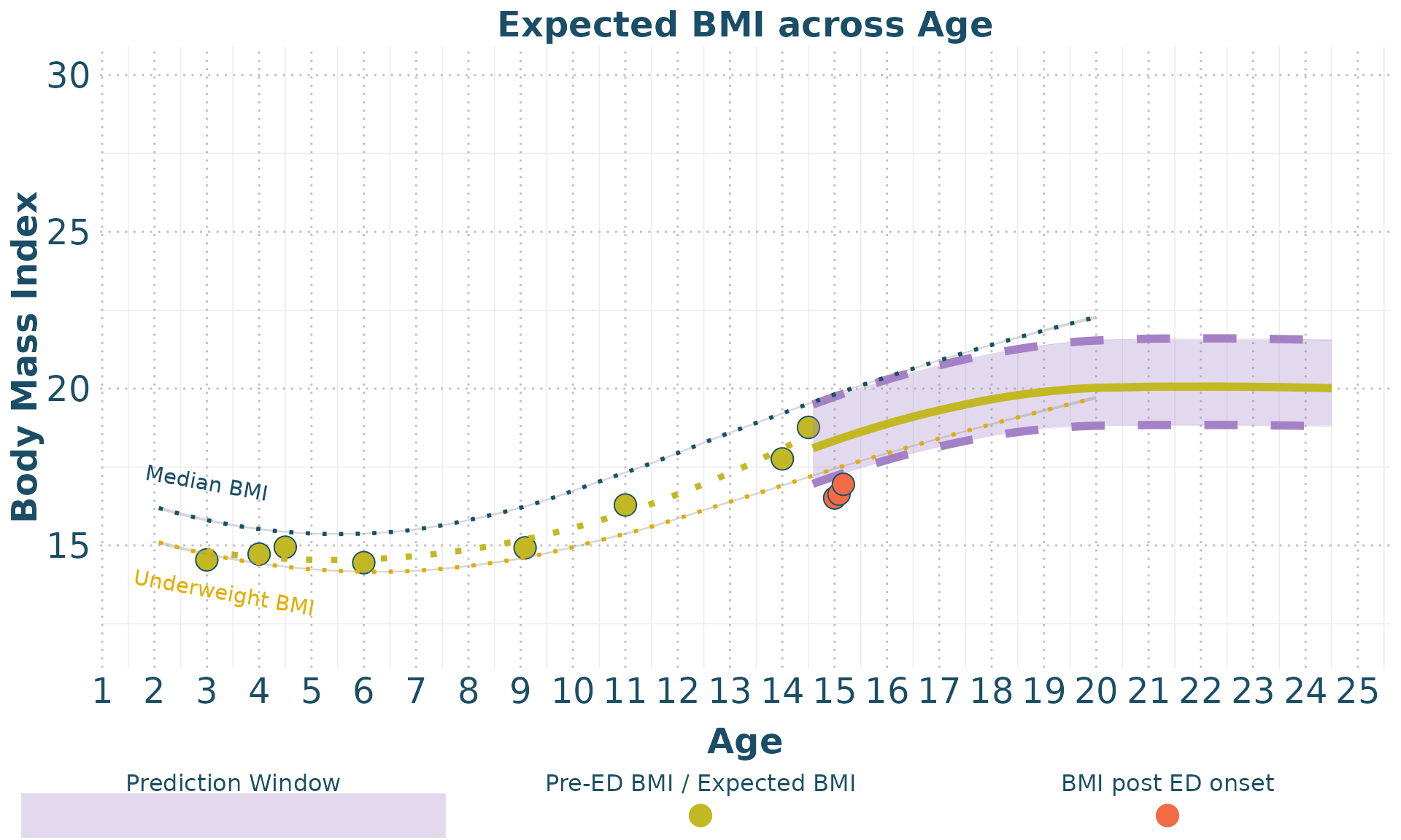 Next, we generate BMI forecasts using the forecast_bmi function. This function calculates future BMI values based on the provided data. For the following example, we use the mean BMIz prior to eating disorder onset as our central value for prediction, with a 95% prediction interval.